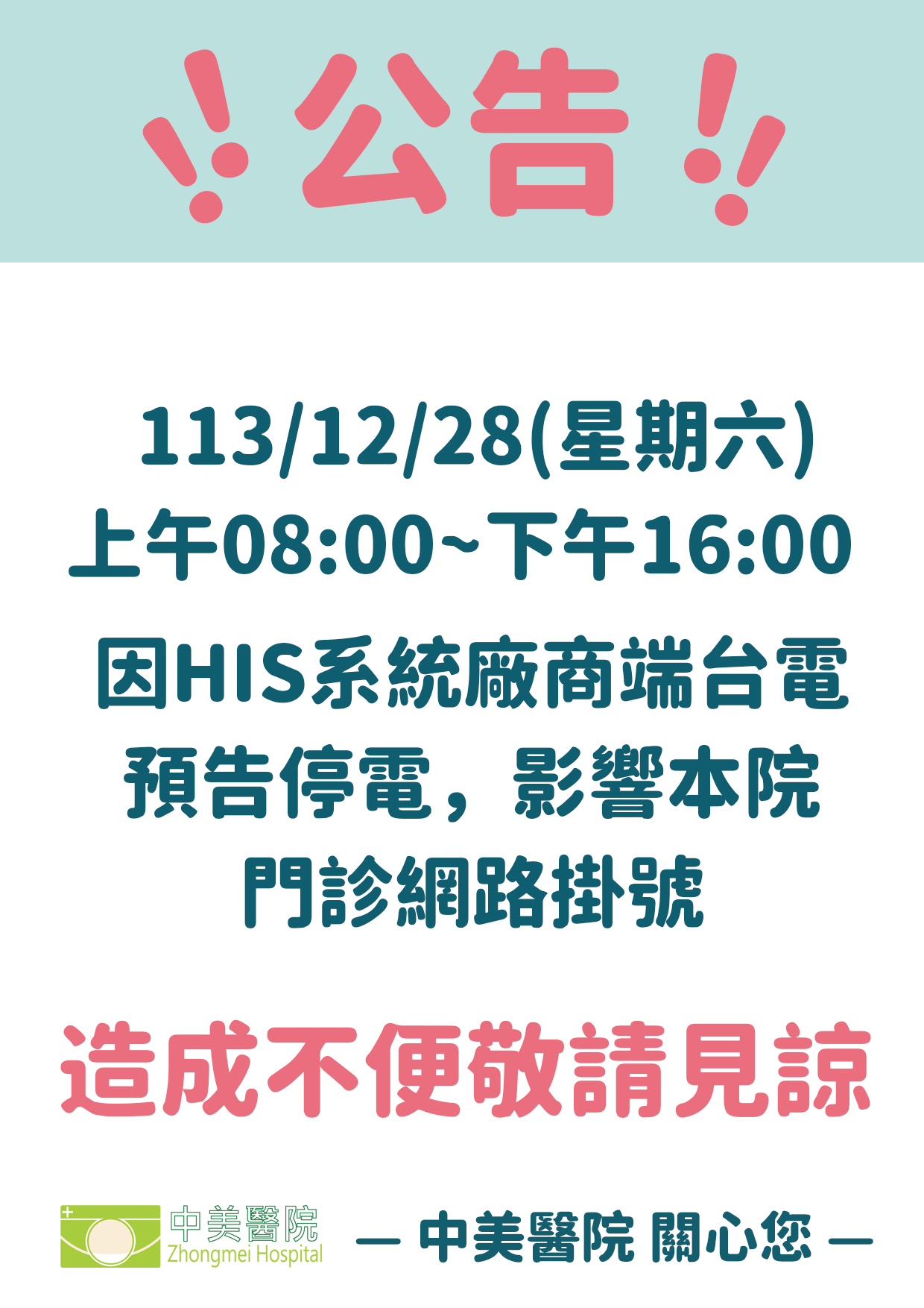 113/12/28(星期六)上午8:00~下午16:00,因HIS系統廠商端台電預告停電,影響本院網路掛號,造成不便,敬請見諒!!