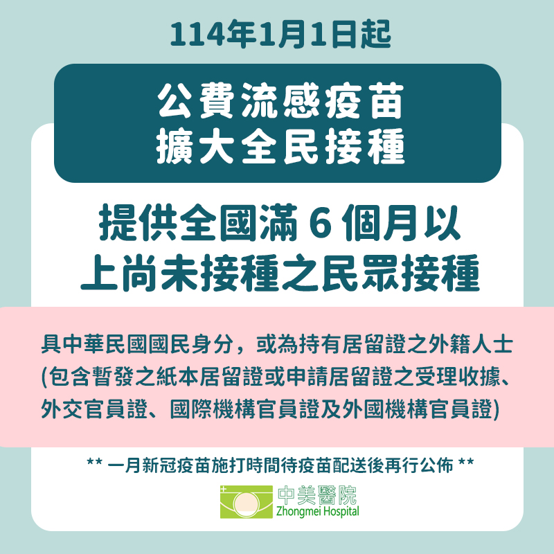 自114年1月1日起,公費流感疫苗擴大提供全國滿6個月以上尚未接種之民眾接種。符合資格之民眾請務必攜帶健保卡前往本院或附近接種所完成施打~中美醫院關心您的健康