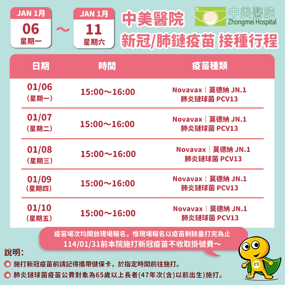 本院(01/06~01/11)疫苗專診請參閱,目前僅有12歲以疫苗~ 肺炎鏈球菌疫苗正式開打嘍,符合公費資格者歡迎前往施打~ 113年4月9日起新冠疫苗開放65歲以上接種第2劑XBB疫苗(與第一劑需間隔84天),提升免疫保護力!