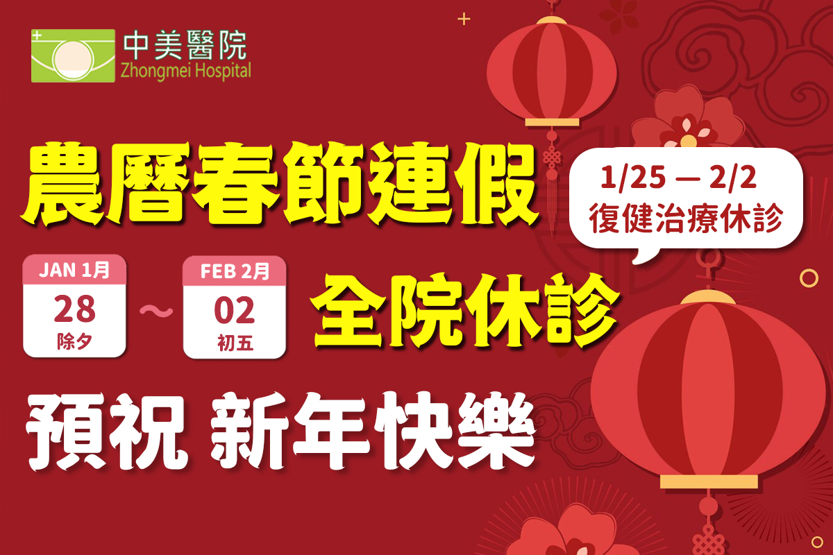 本院農曆春節連假休診公告,請參閱: 114/01/28 —— 114/02/02 全院休診 114/01/25 —— 114/02/02 復健科休診 不便之處敬請見諒~