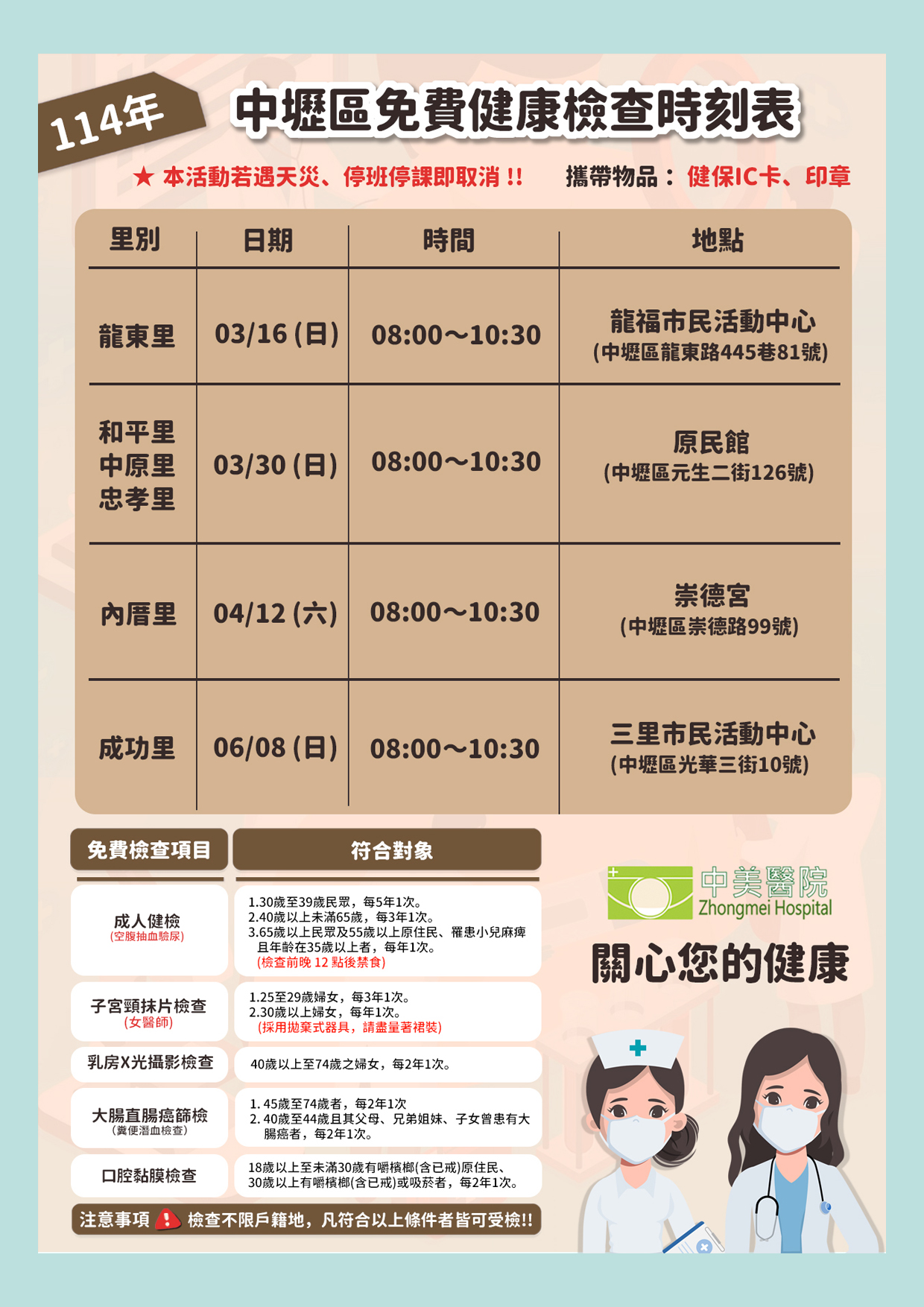 本院將於以下時段在中壢區各里別舉辦免費健康檢查,符合資格者請攜帶您的健保IC卡、印章前往社區做檢查~