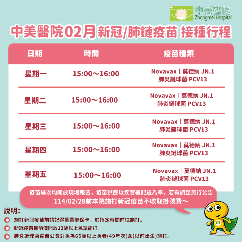 本院2月疫苗專診請參閱~ 肺炎鏈球菌疫苗正式開打嘍,符合公費資格者歡迎前往施打~ 113年4月9日起新冠疫苗開放65歲以上接種第2劑XBB疫苗(與第一劑需間隔84天),提升免疫保護力!