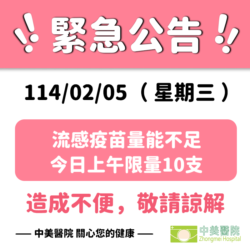 因接種人數眾多,疫苗量能不足, 明日院內流感疫苗數量有限,上午限量10 不便之處,請多包涵~