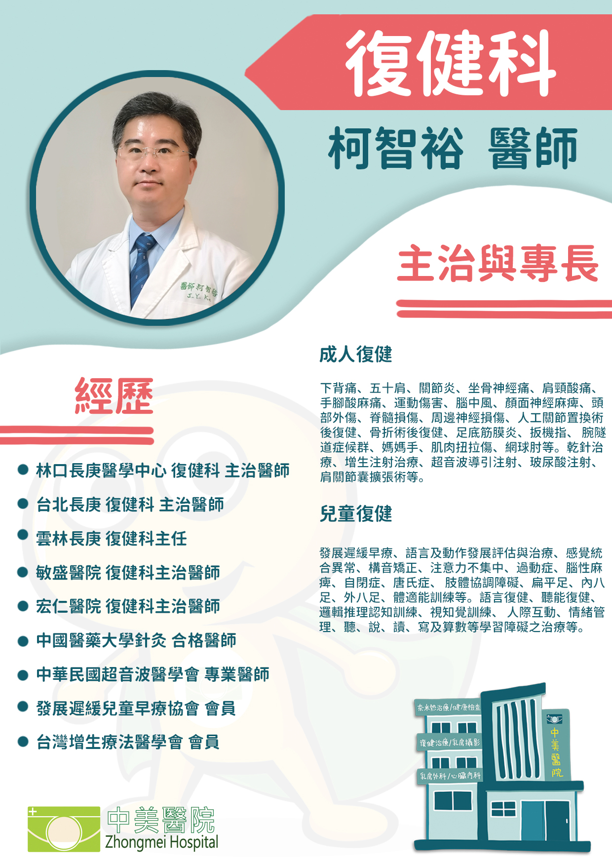 3月起新進復健科 柯智裕醫師 柯醫師學有所長,是本院復健科的新血,服務時間為每星期四 午診時段,歡迎他加入中美醫院大家庭為民眾服務~