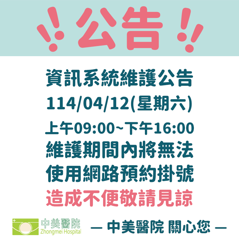 資訊系統維護公告,114/04/12(星期六)09:00—16:00,維護期間內將無法使用網路預約掛號,造成不便,敬請見諒!!