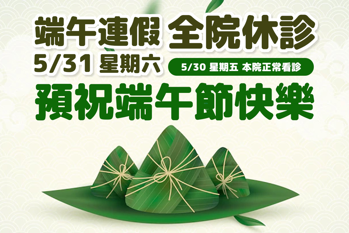 本院於05/31(星期六)全院休診,05/30仍正常看診,造成不便,敬請見諒~ 預祝端午節快樂