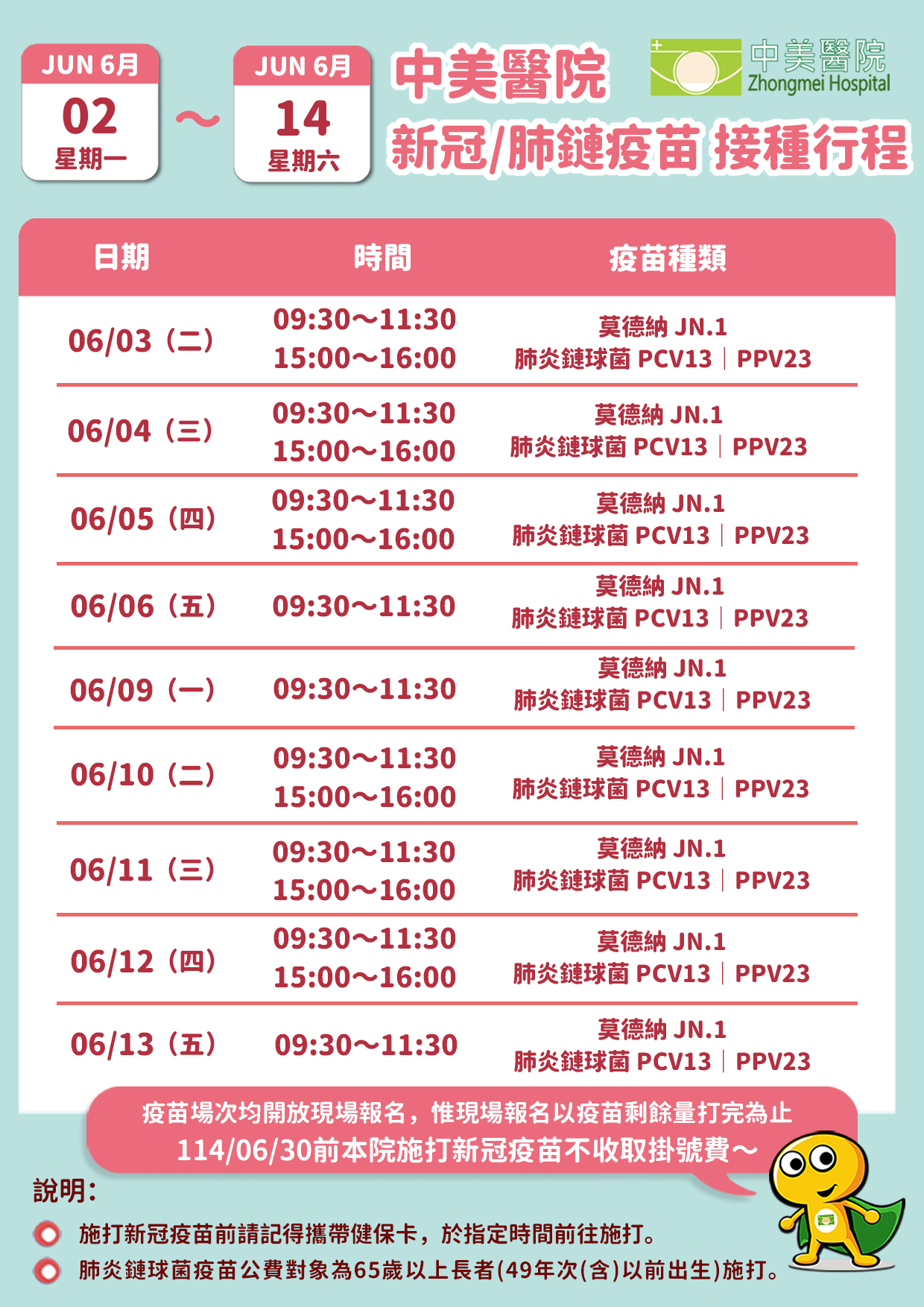 因應疫情升溫,本院新增疫苗專診請參閱~ 肺炎鏈球菌疫苗正式開打嘍,符合公費資格者歡迎前往施打~