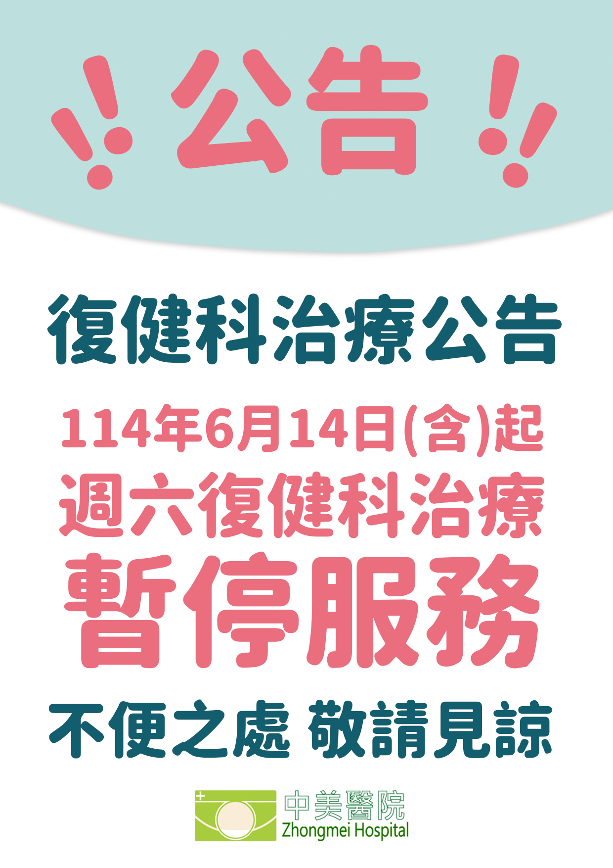 114年6月14日(含)起,週六復健科治療暫停服務,不便之處,敬請見諒!!