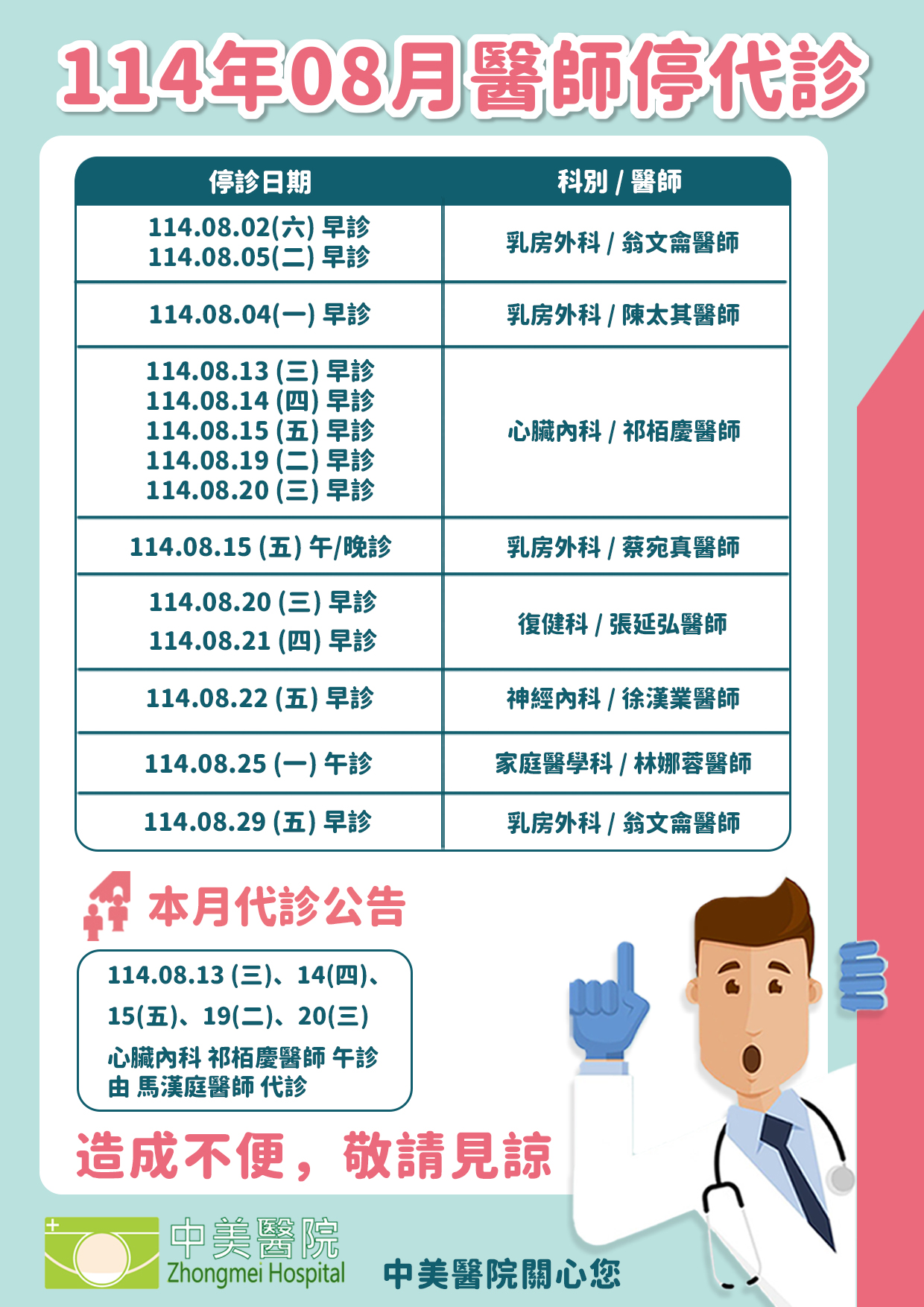 114年08月 醫師停代診公告