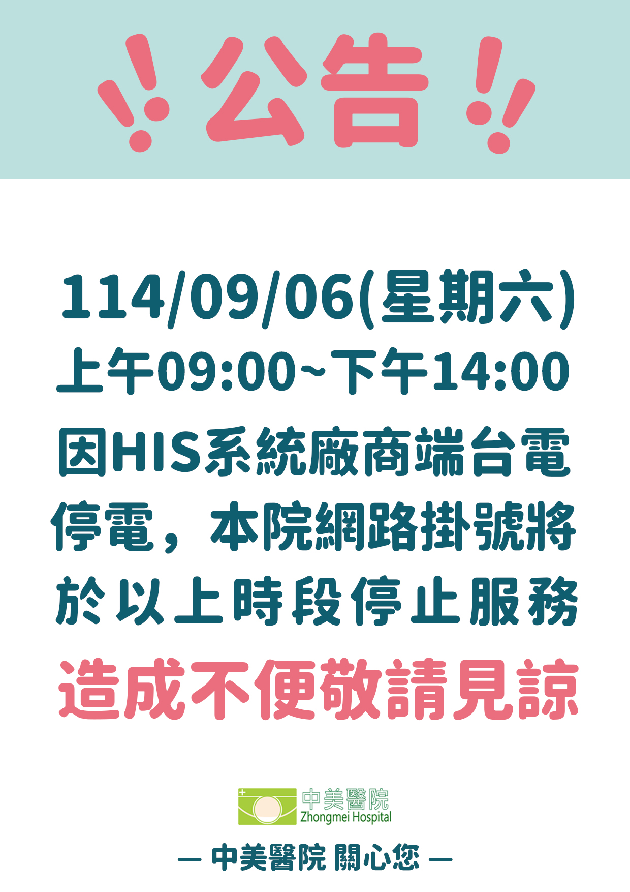 114/09/06(星期六)因HIS系統廠商端台電預告停電,本院網路掛號將於09:00—14:00停止服務~造成不便,敬請見諒!!