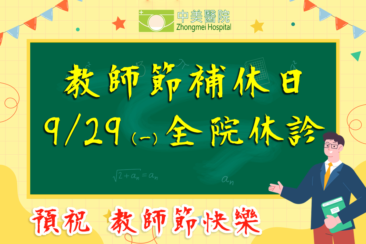本院將於 114/09/29 (星期一)全院休診~ 提醒您提前規劃看診時間,造成不便,敬請見諒!預祝各位老師 教師節快樂,身體健康。