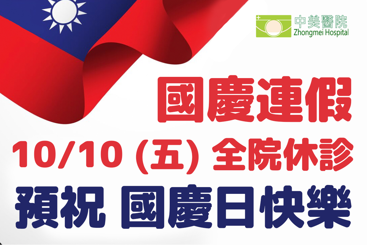 本院於114/10/10(星期五)全院休診,請提前安排就診,造成不便,敬請見諒! 預祝佳節愉快,平安健康~