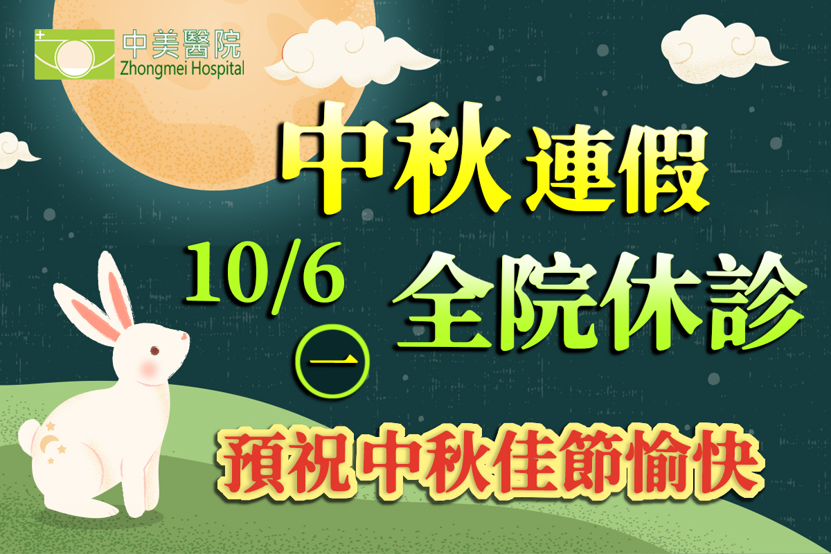 為歡慶中秋,本院將於 10月6日(星期一)全院休診,造成不便,敬請見諒!預祝 中秋節快樂~