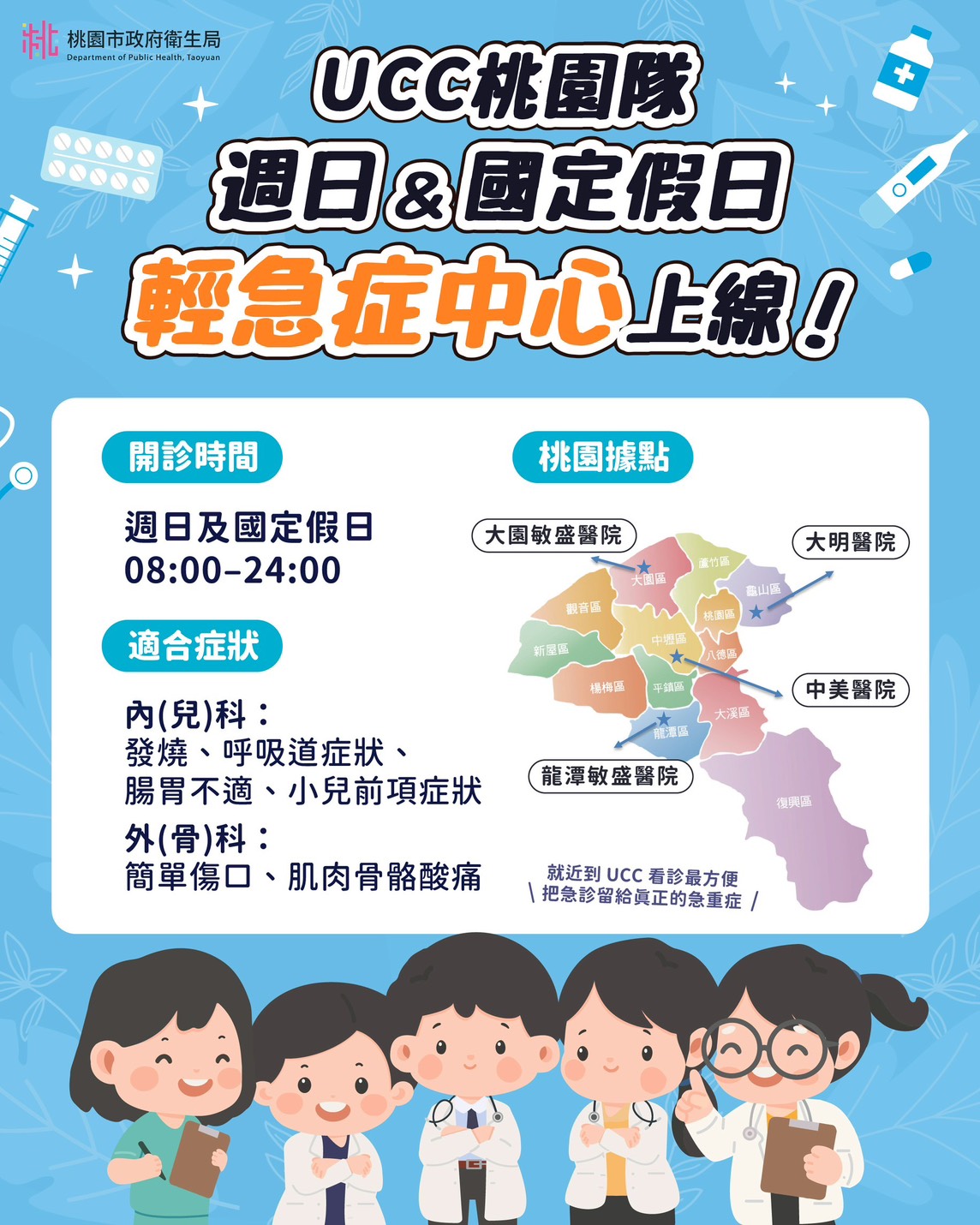 UCC桃園隊 輕急症中心上線囉! 桃園市政府衛生局貼心推出「UCC輕急症中心」,看診收費較便宜(掛號費250元+部分負擔150元),提供內(兒)科、外(骨)科的即時服務,本院為桃園市UCC輕急症中心之一,就近來看診最方便,把急診留給真正的重症!